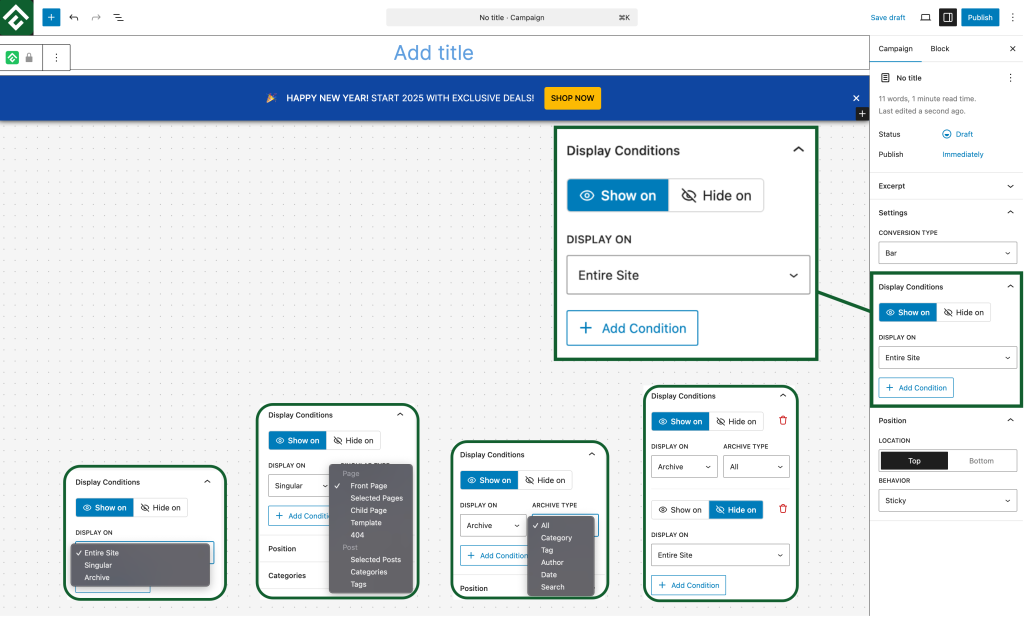 Until now, ConvertForce campaigns displayed globally by default. But with Display Conditions, you can target visitors with precision – based on categories, tags, pages, posts, templates, archives, and more.